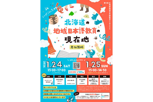 - 【ハイブリッド開催】第5回北海道地域日本語教育シンポジウム「北海道の地域日本語教育の現在地」開催のお知らせ【高等教育推進機構 国際教育研究部】(2026年1月24日(土)、25日(日)開催)