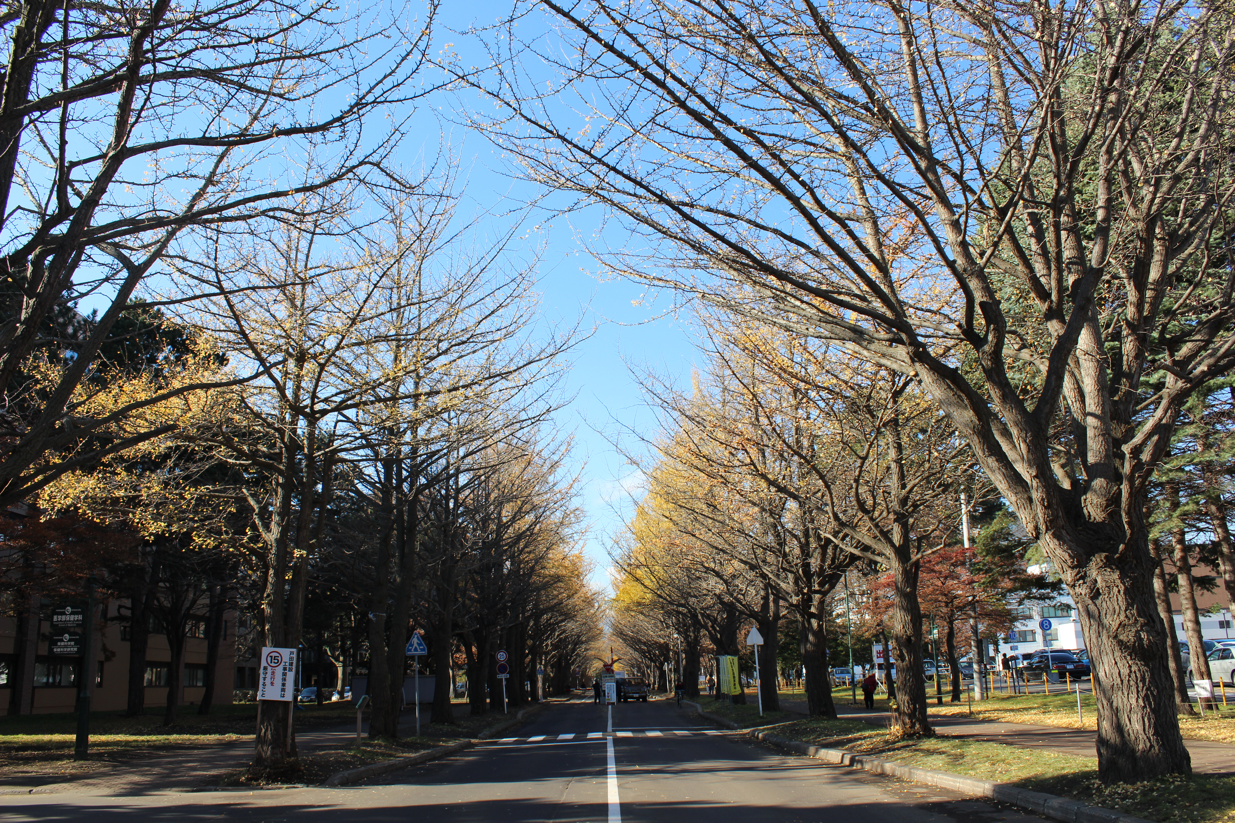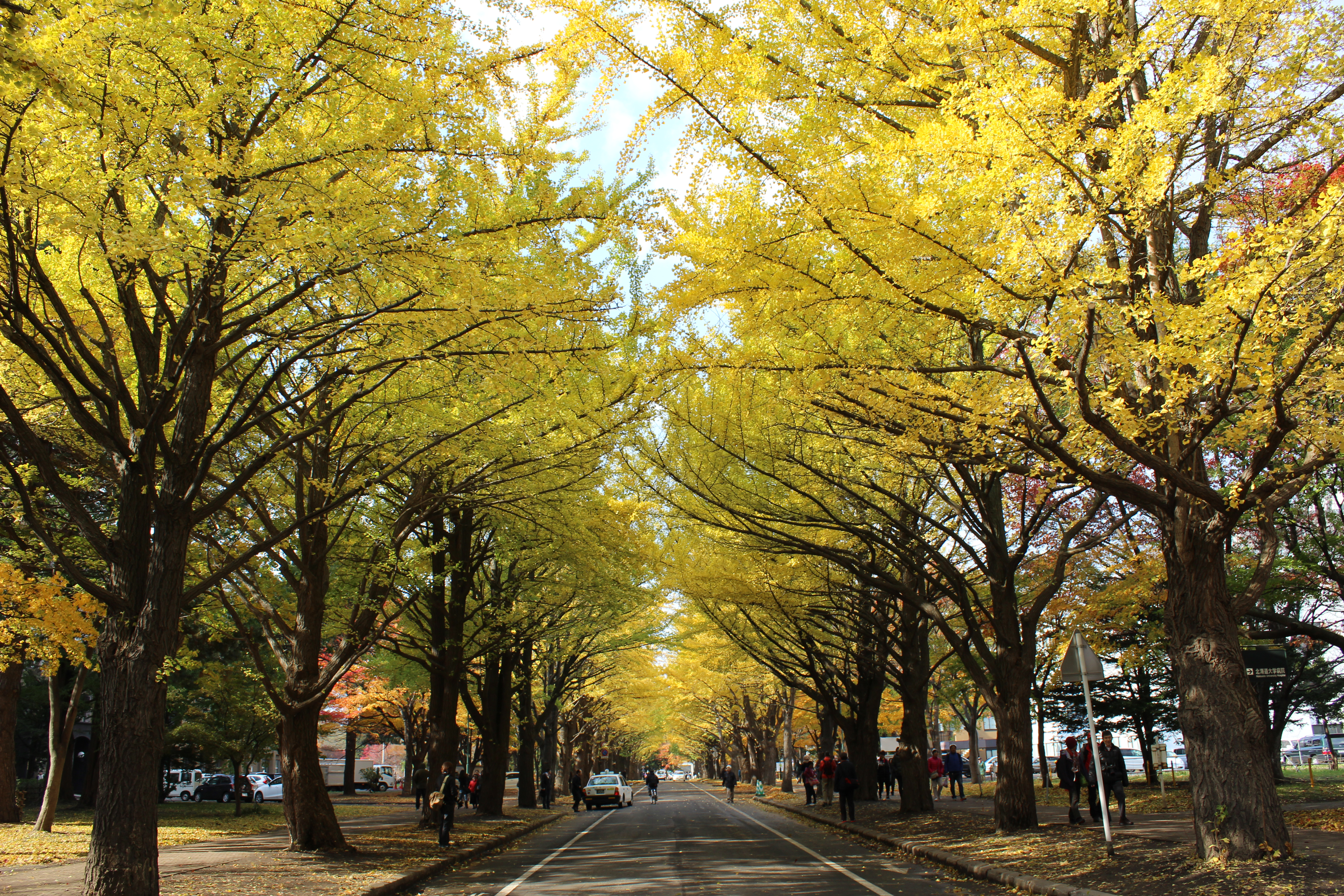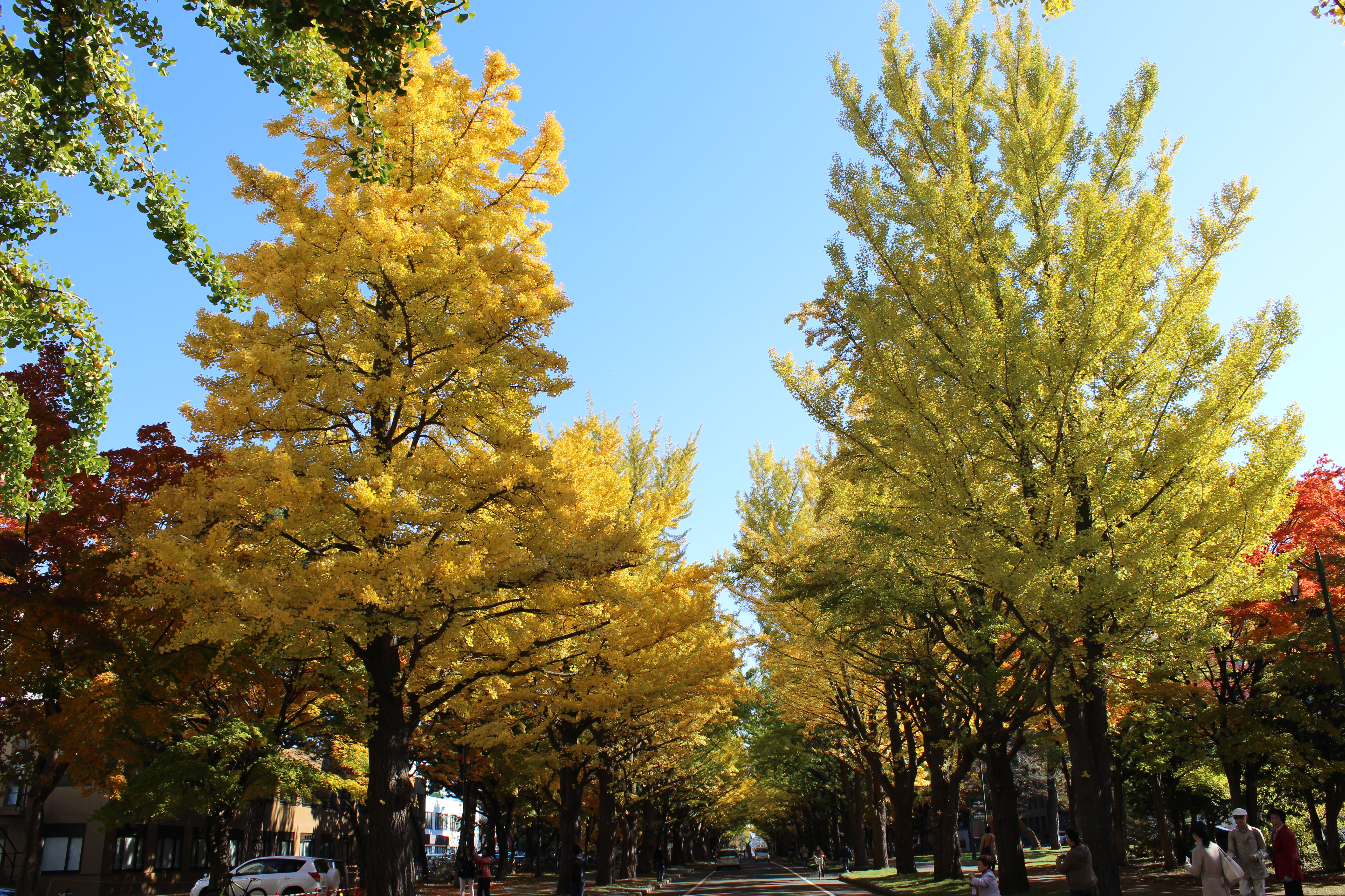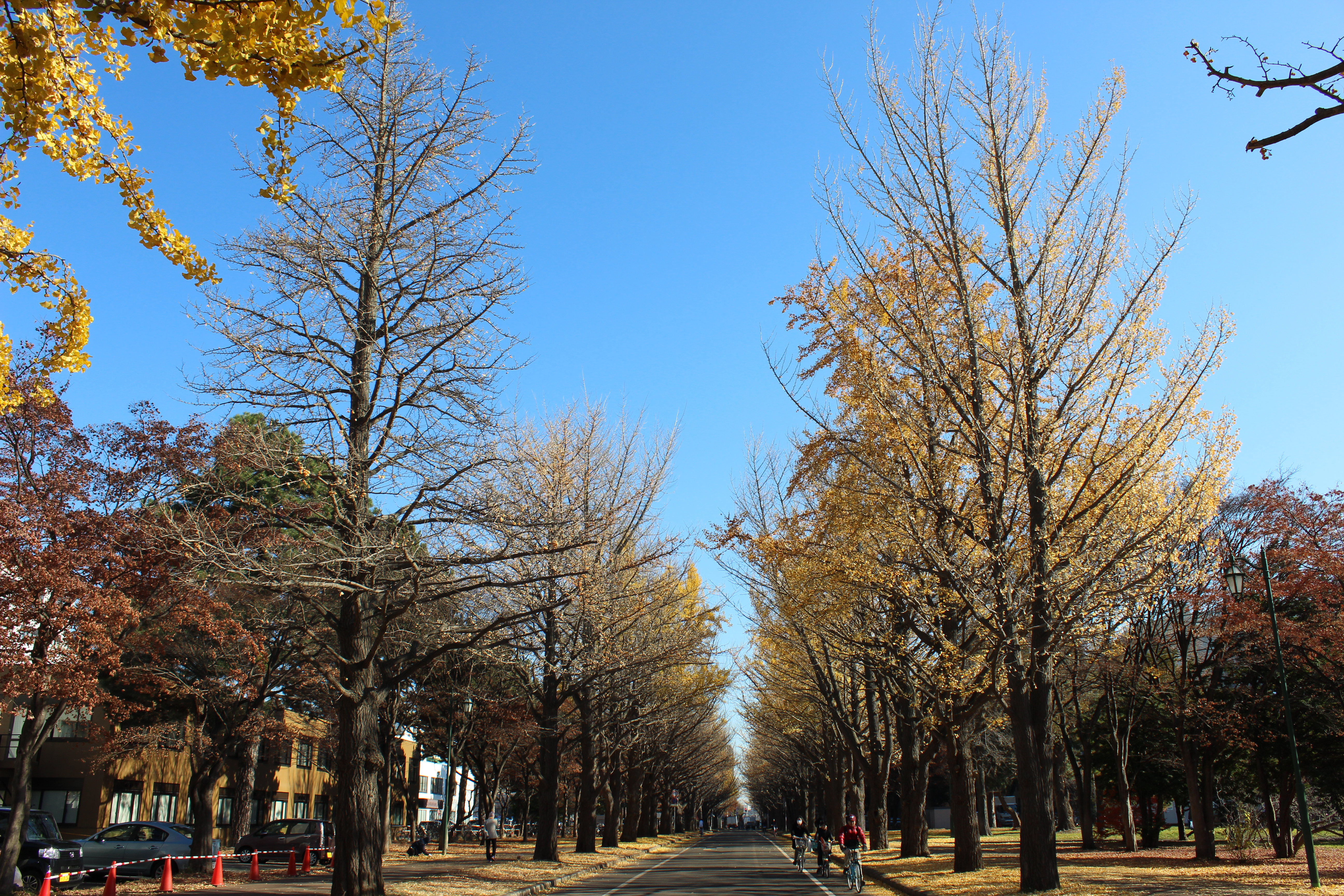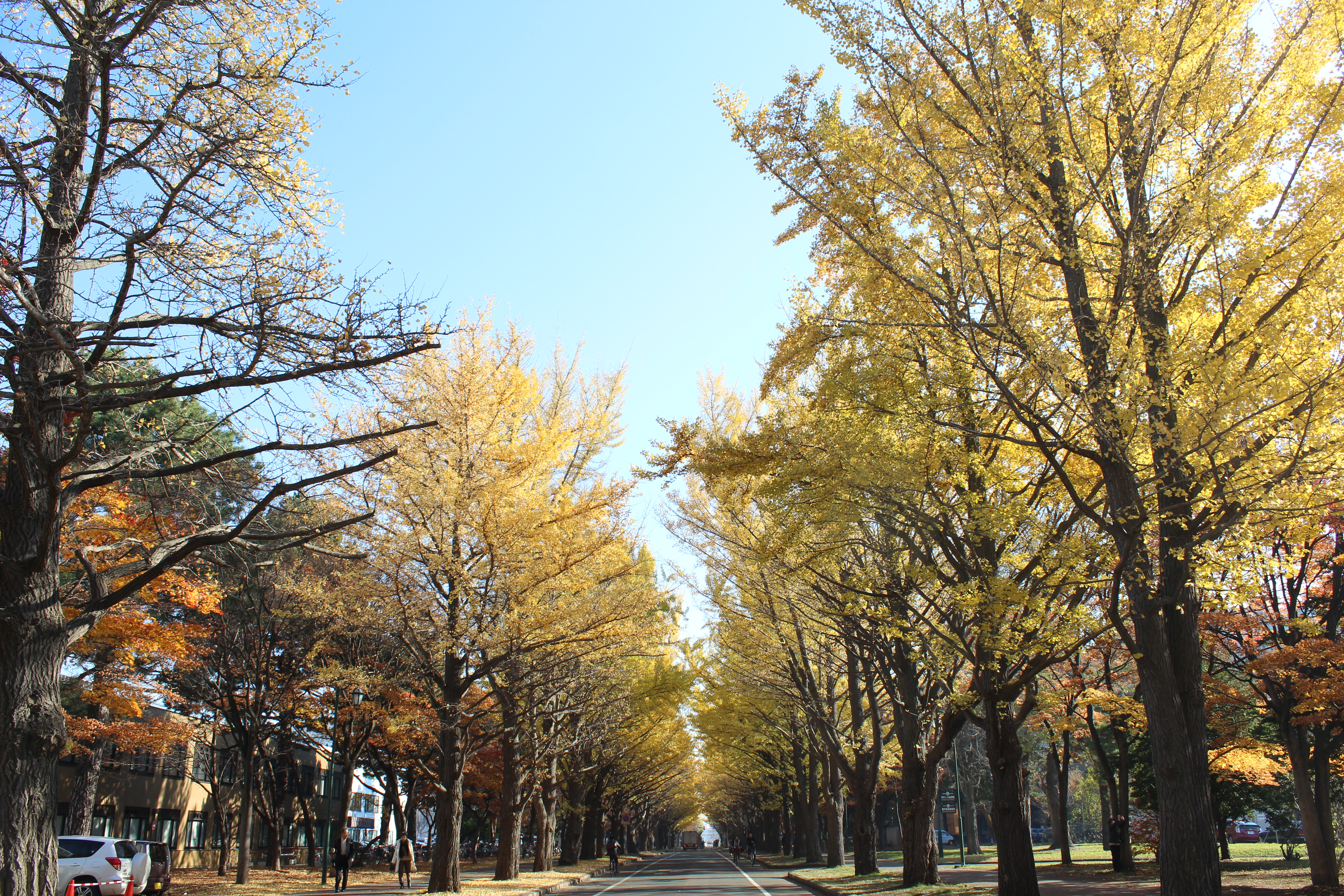北大構内の北13条通り両側、東西約380メートルにわたる70本のイチョウ並木。例年10月下旬から