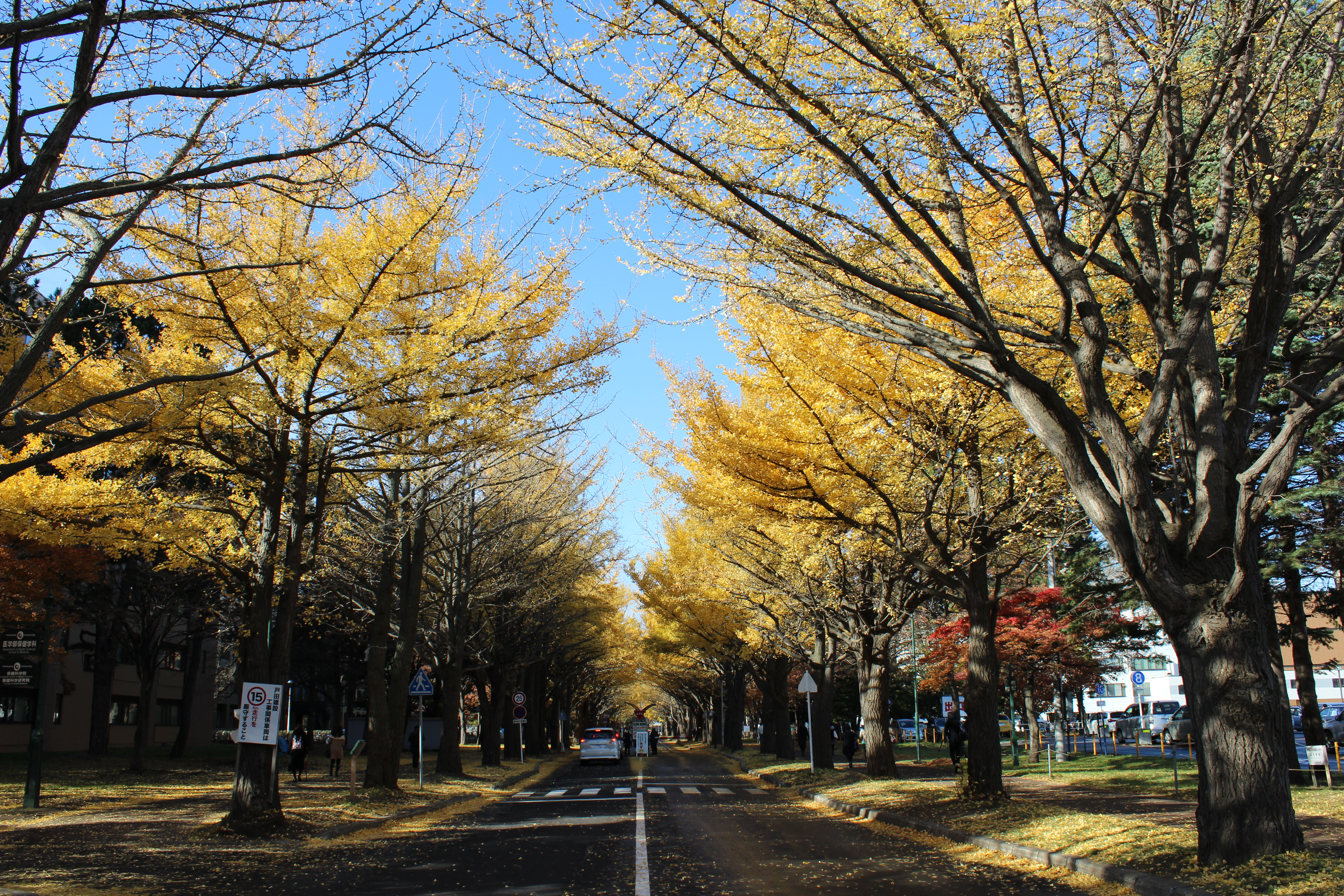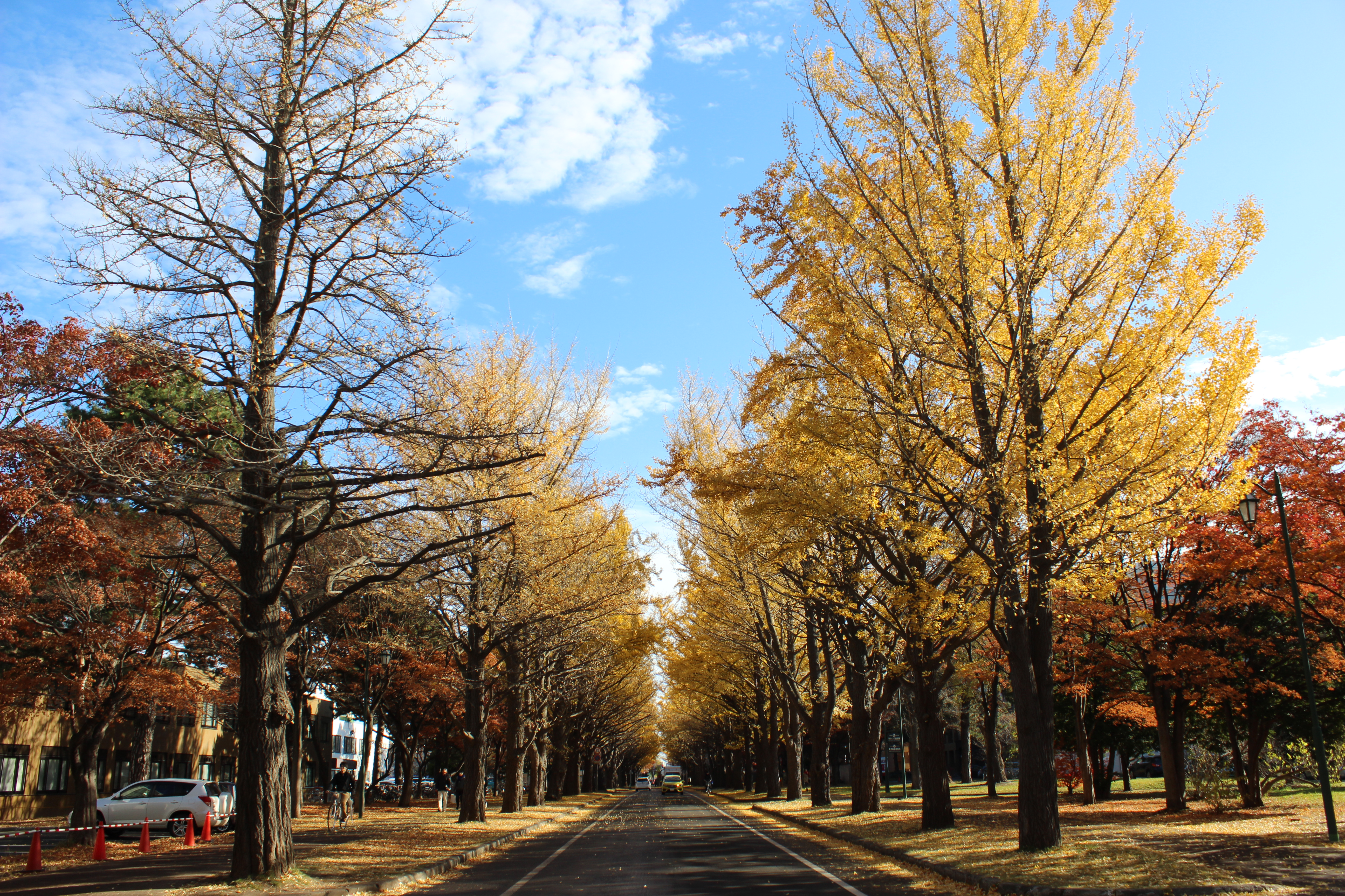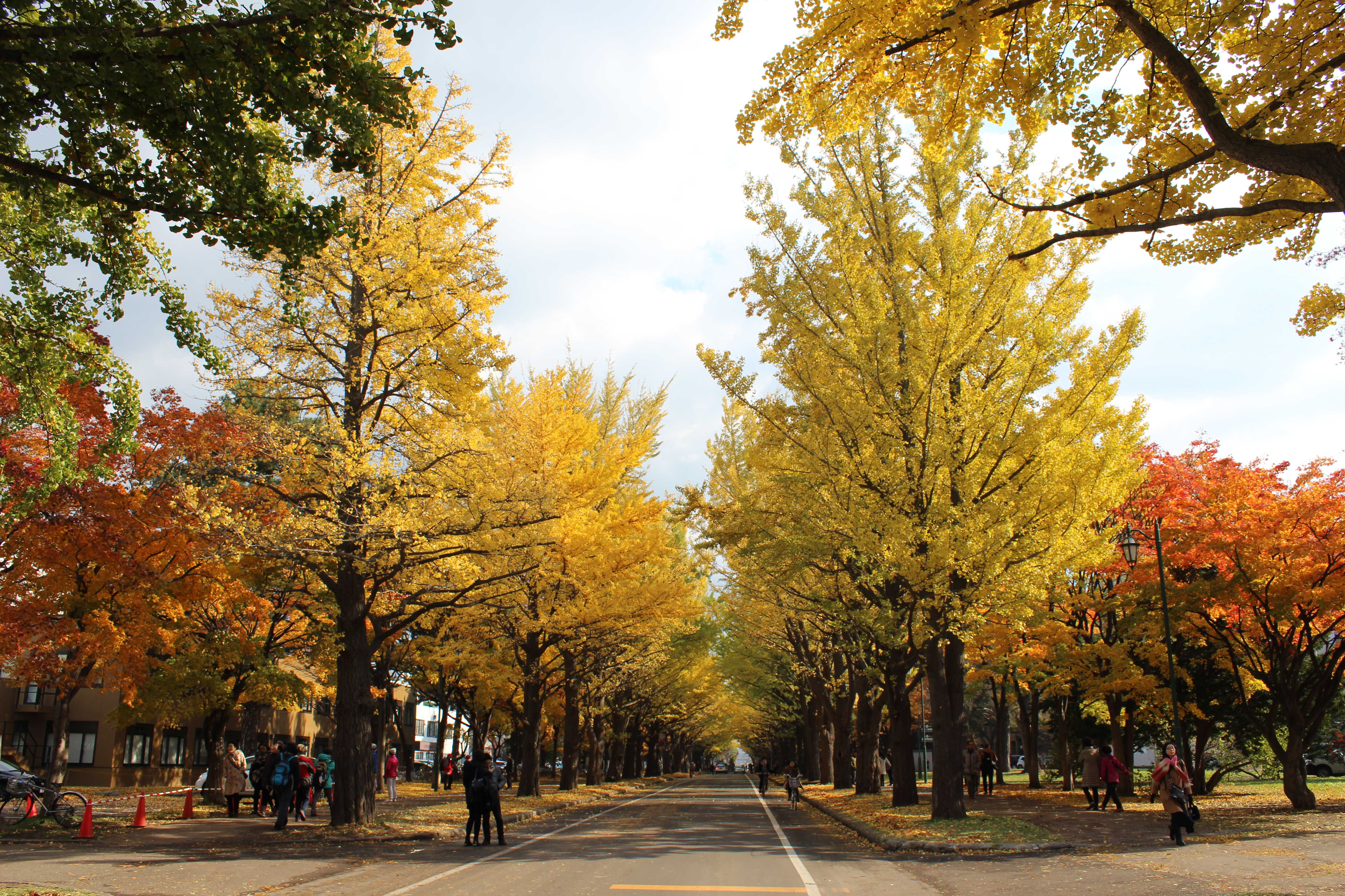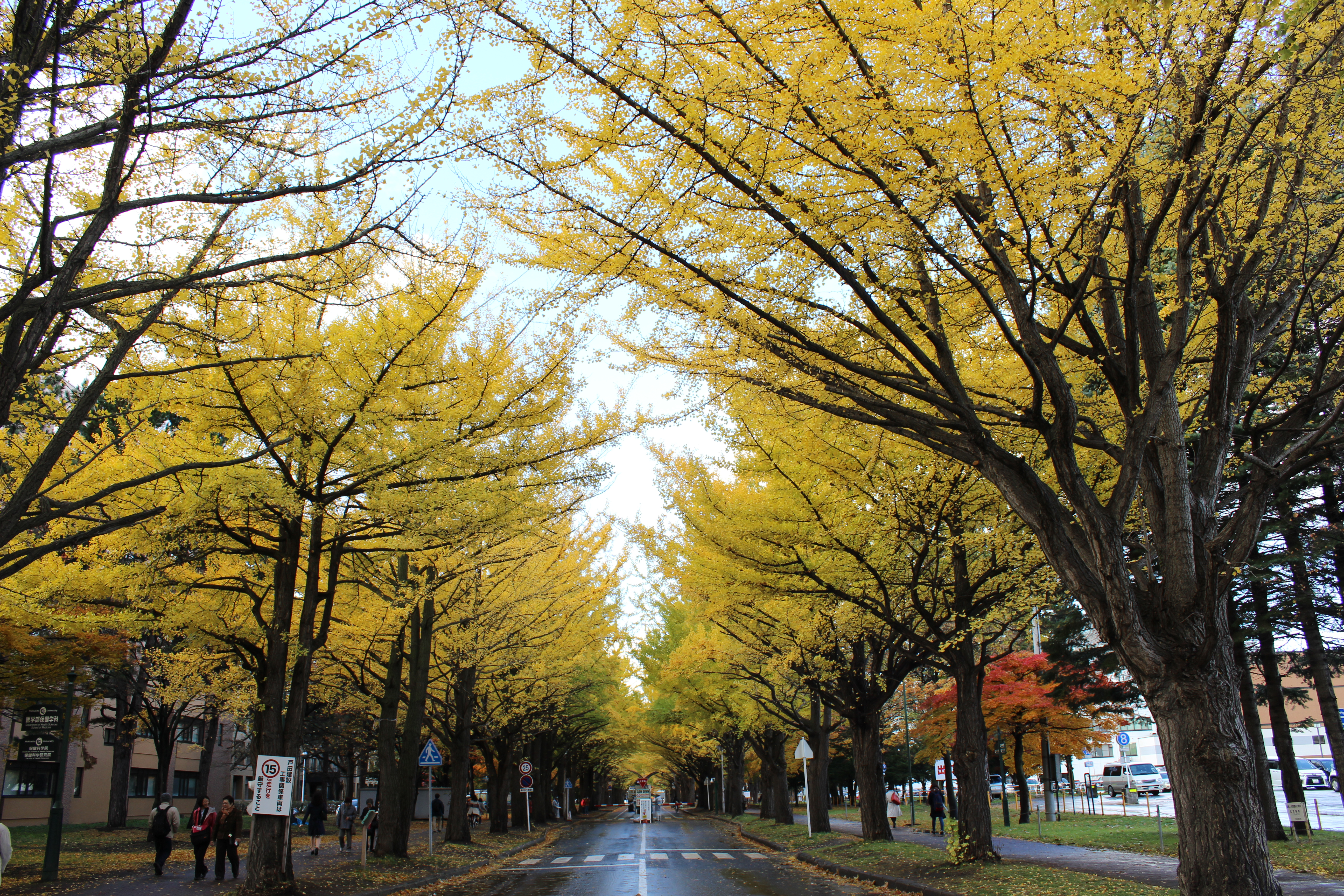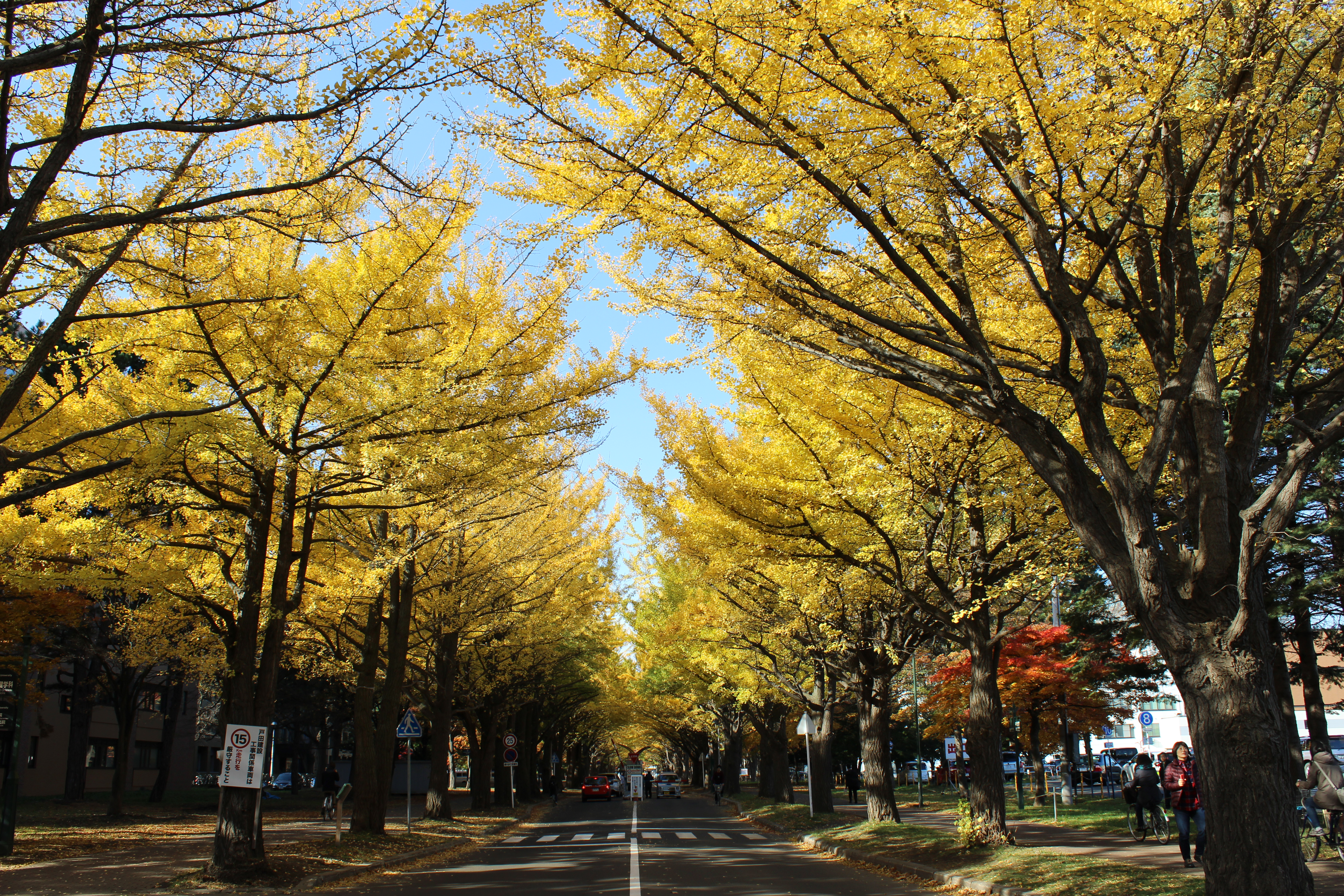 北大構内の北13条通り両側、東西約380メートルにわたる70本のイチョウ並木。例年10月下旬から