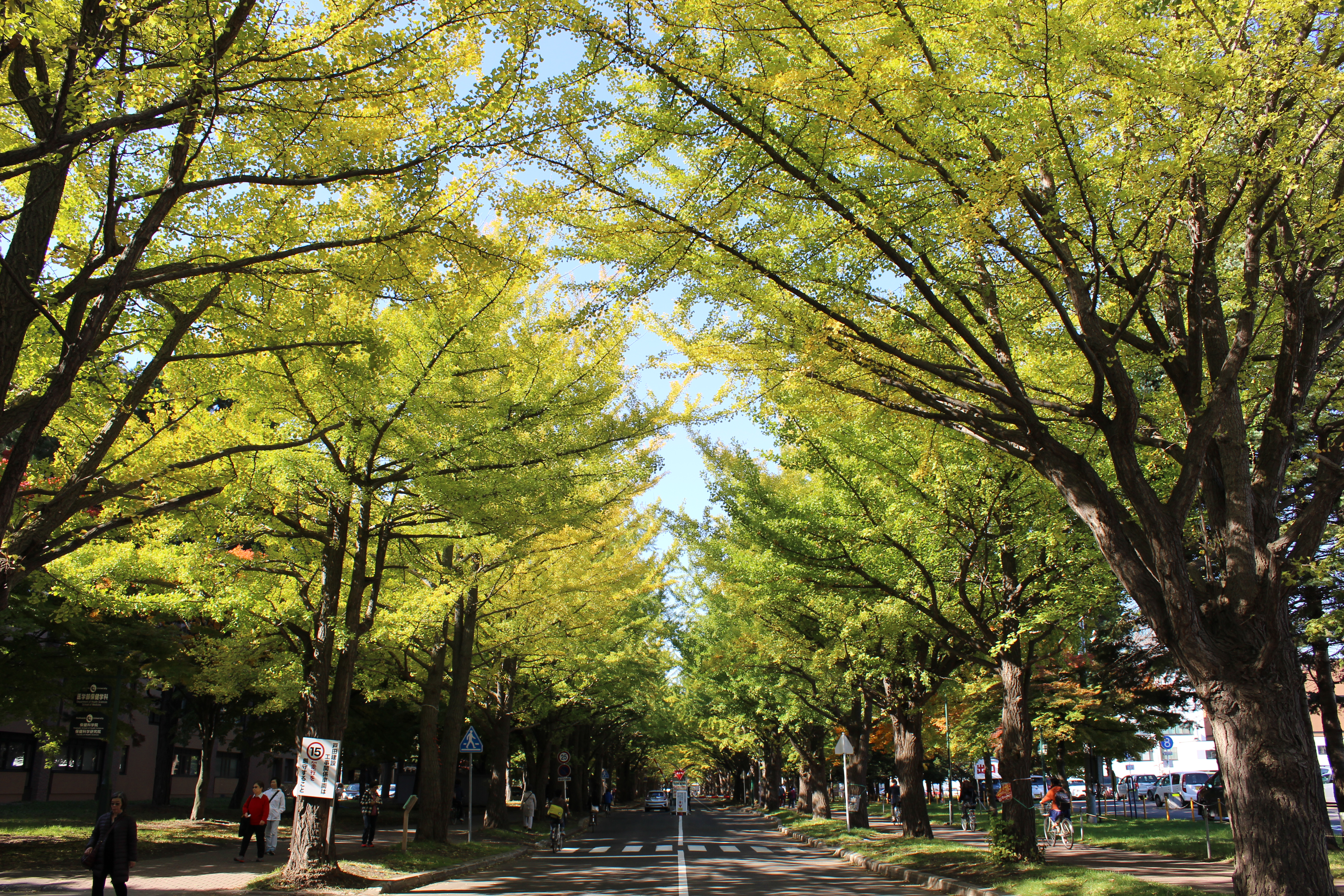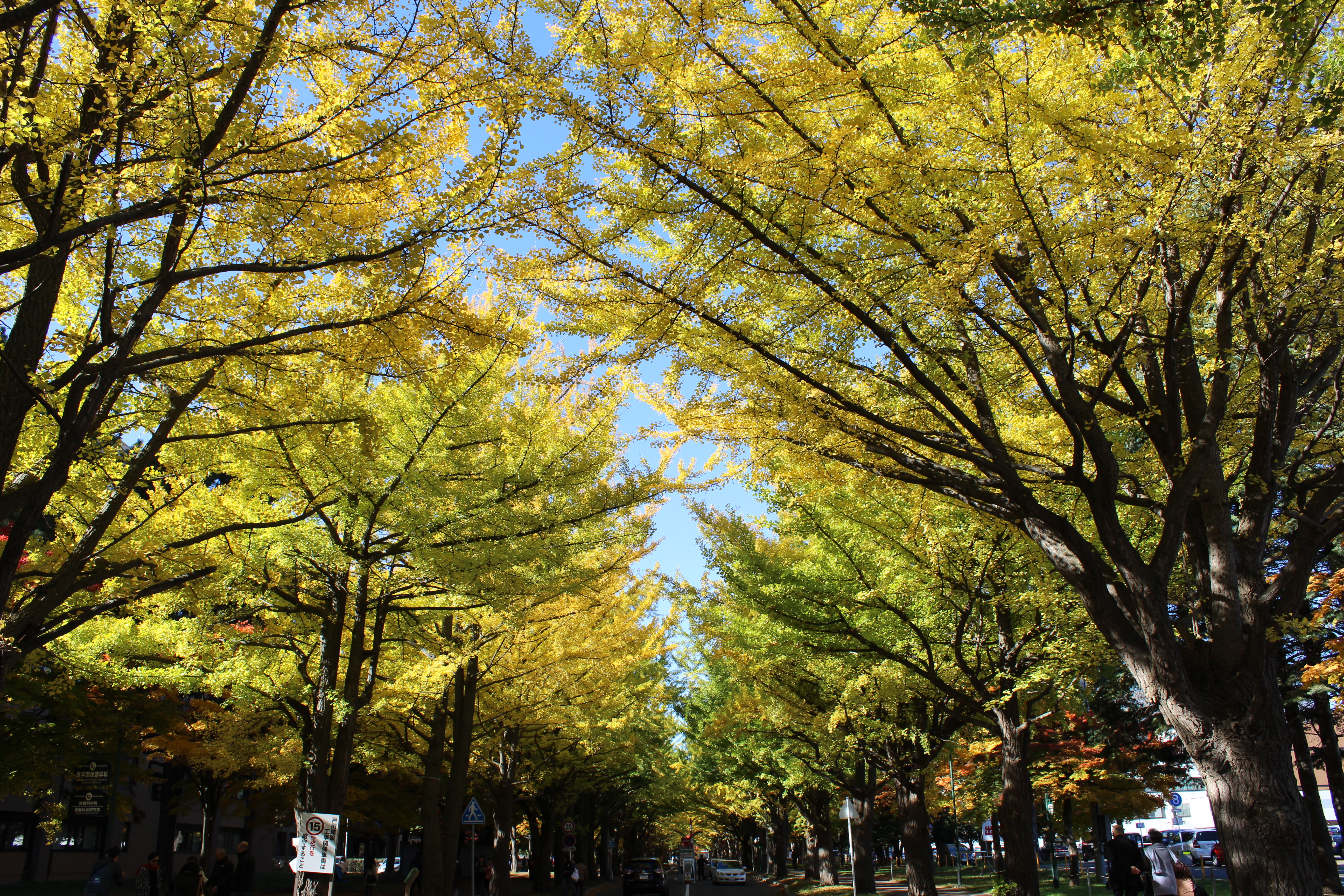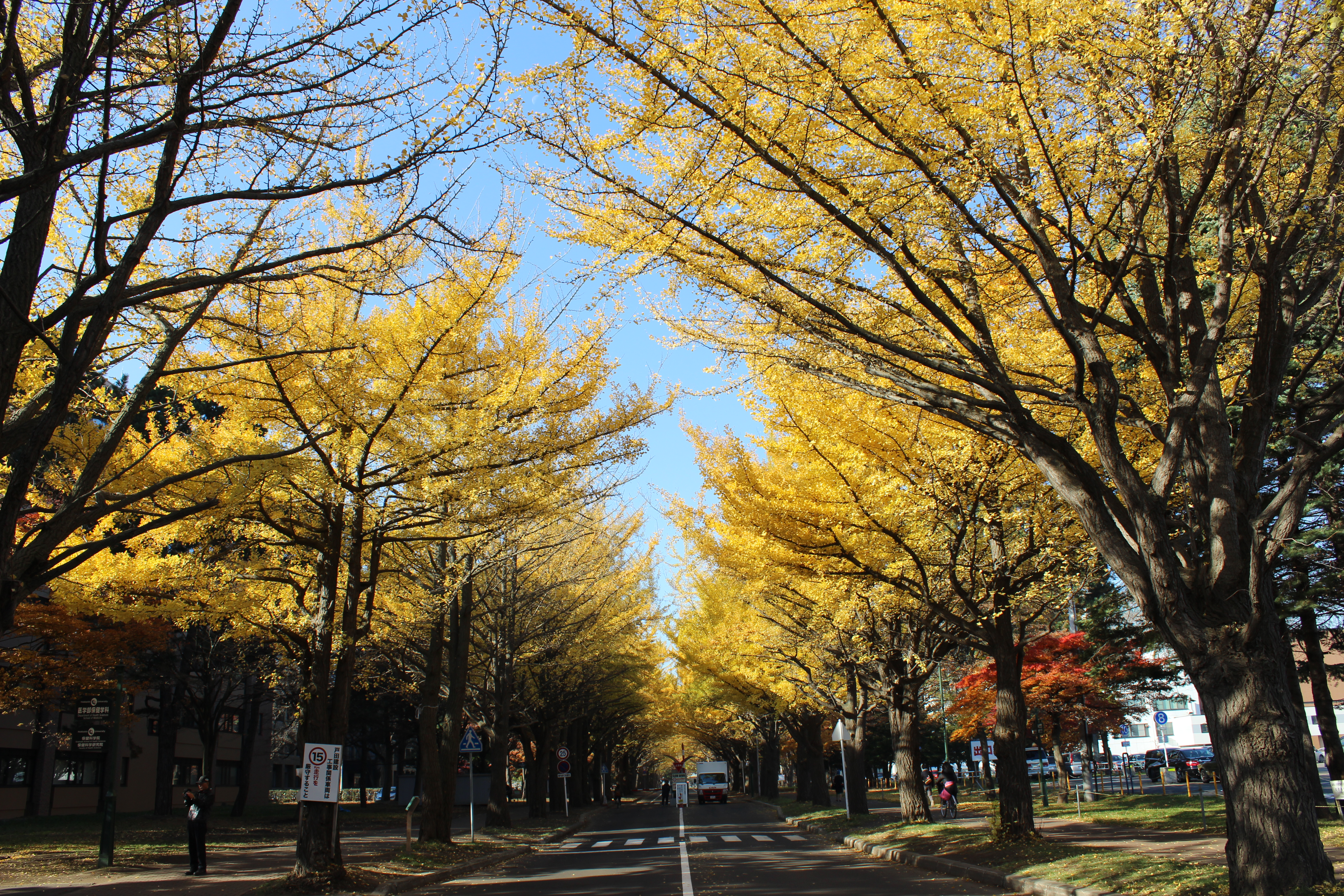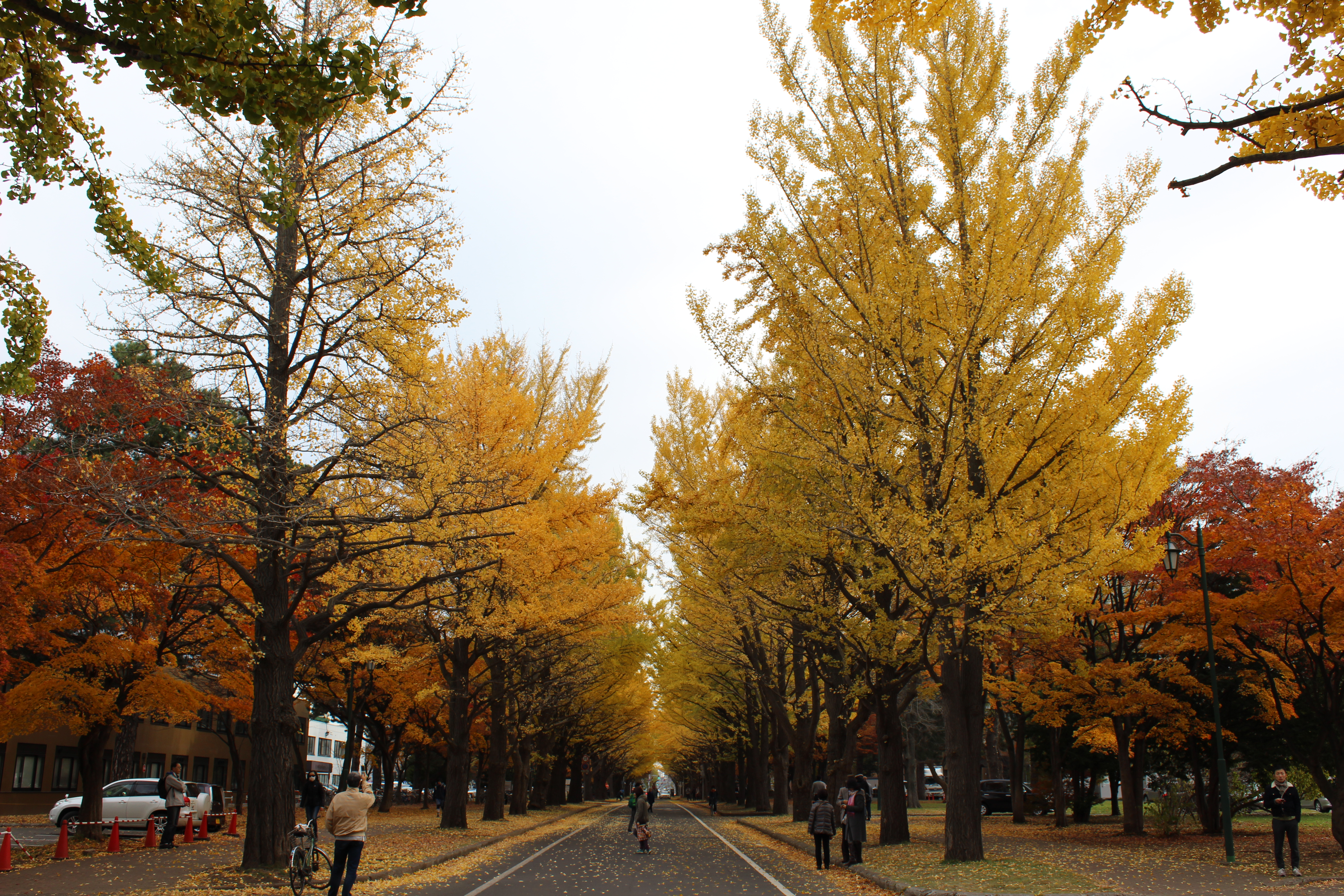 北大構内の北13条通り両側、東西約380メートルにわたる70本のイチョウ並木。例年10月下旬から