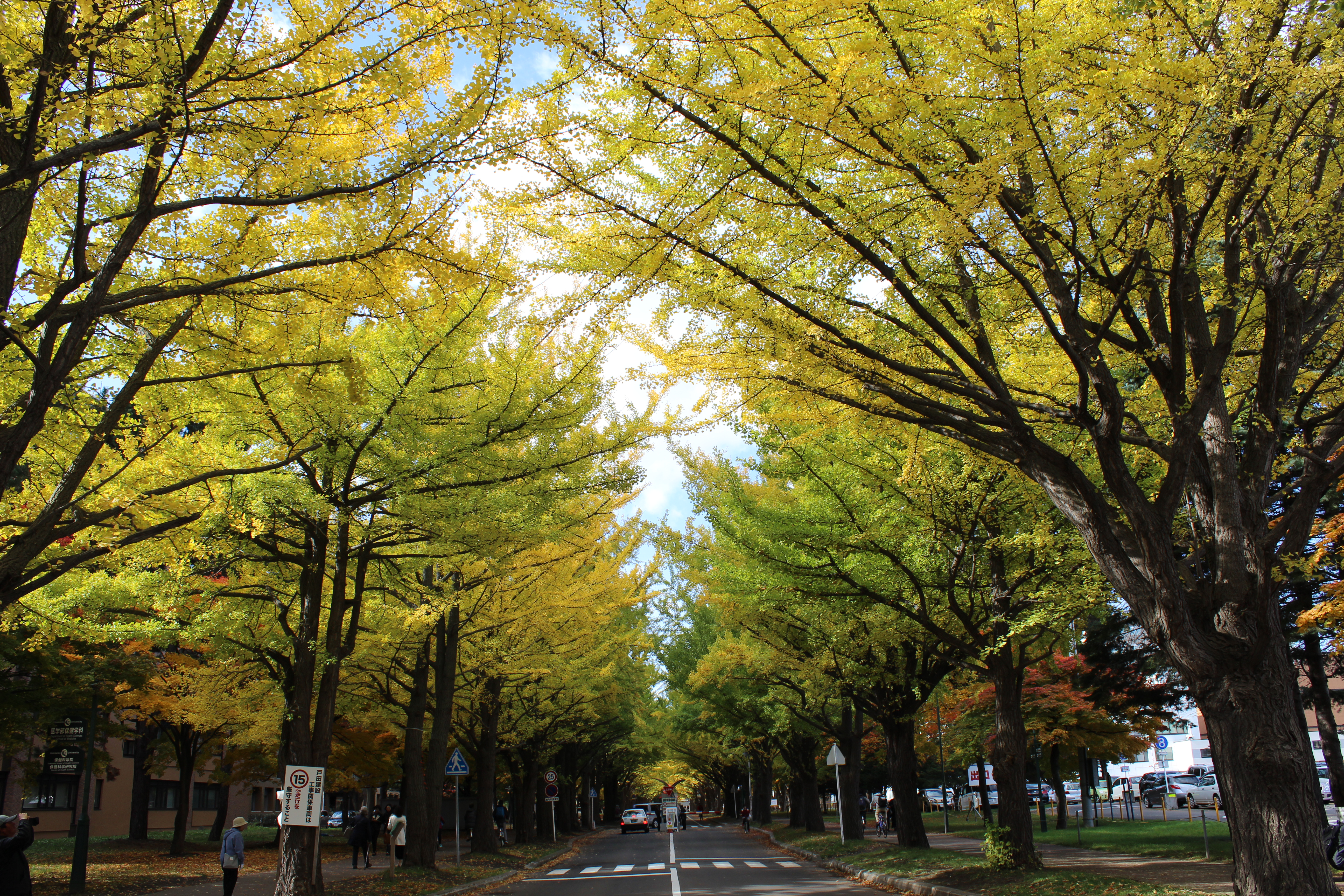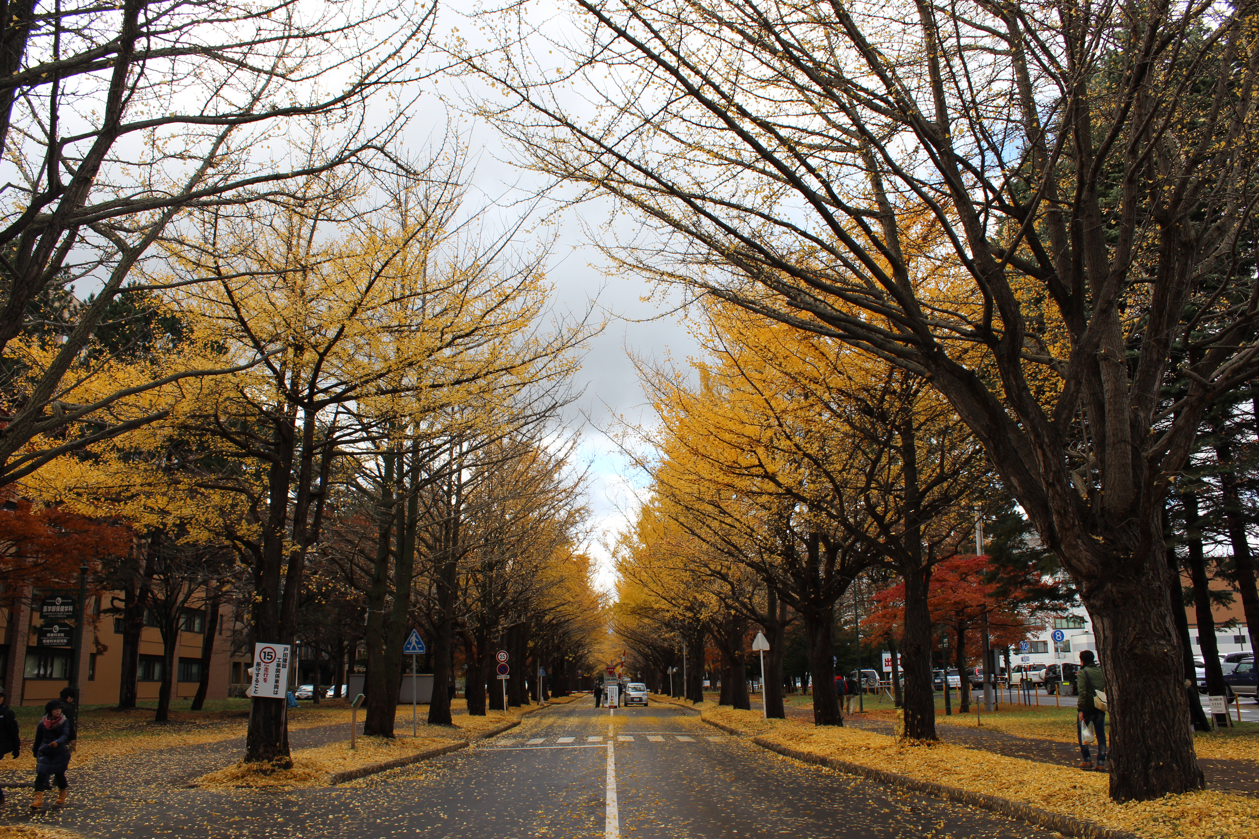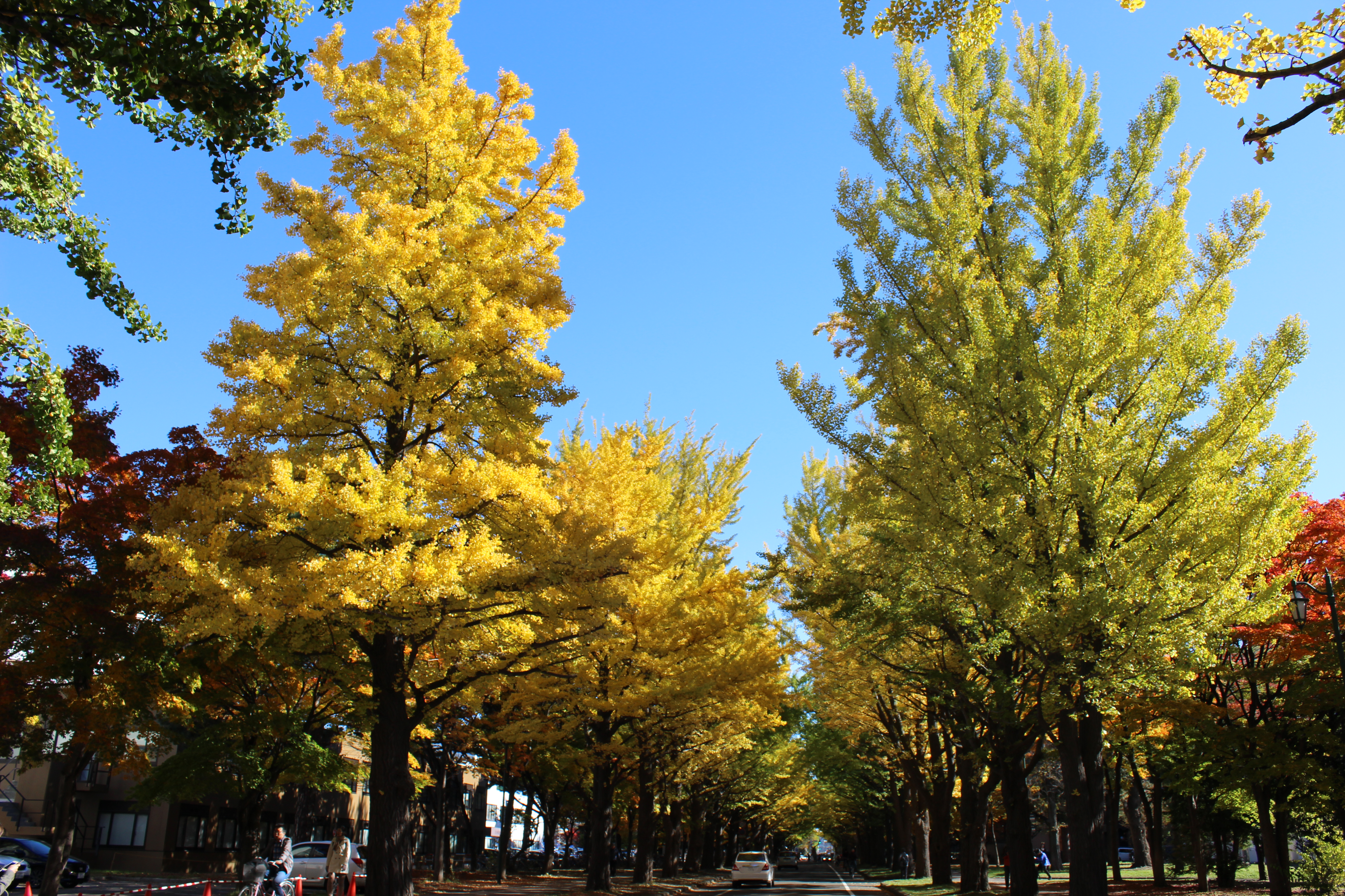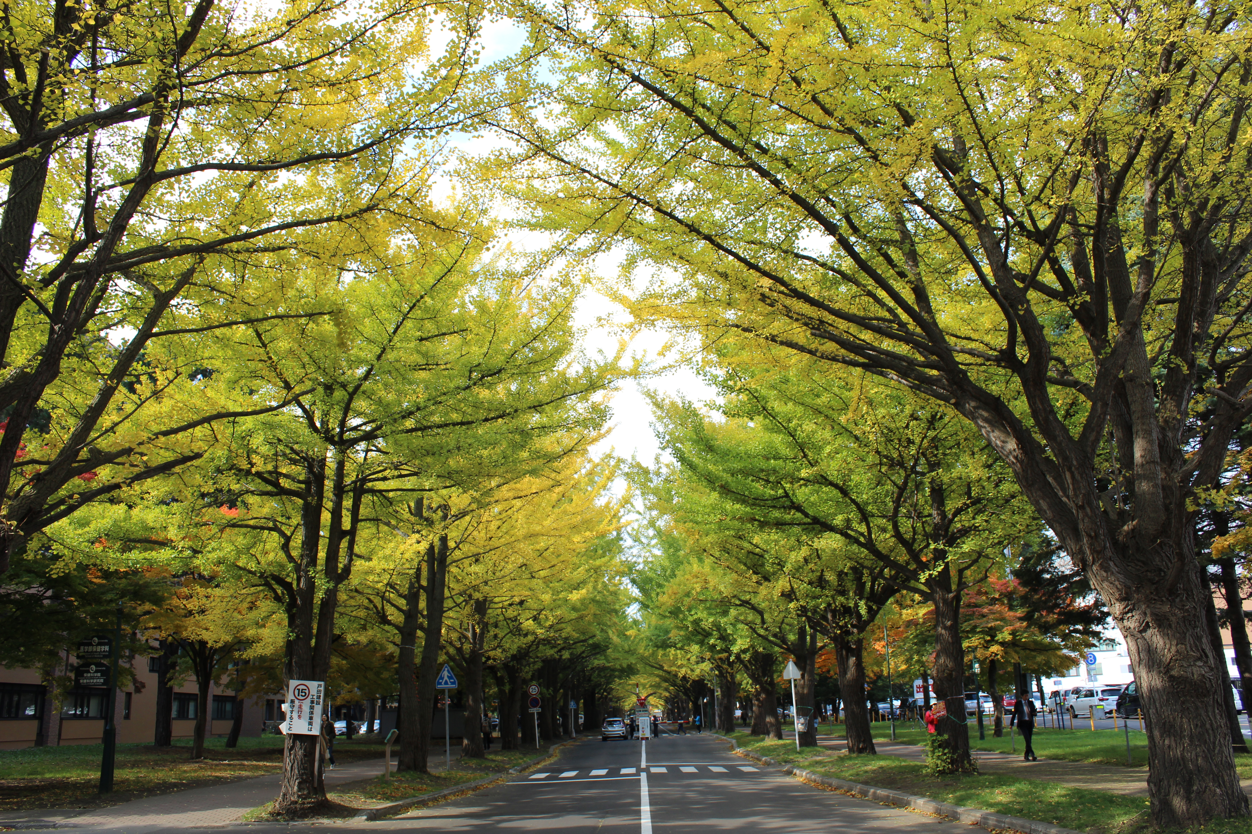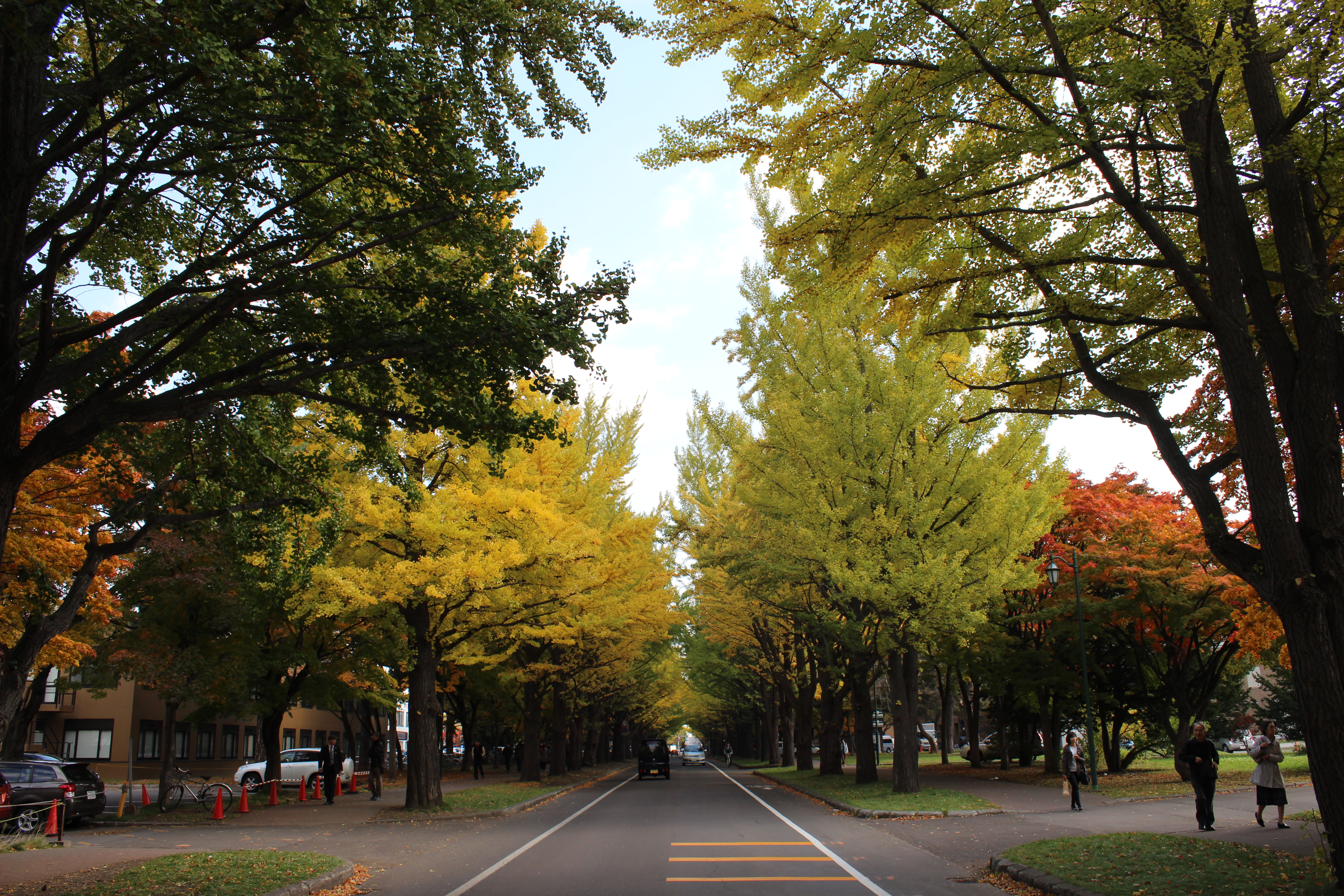 北大構内の北13条通り両側、東西約380メートルにわたる70本のイチョウ並木。例年10月下旬から