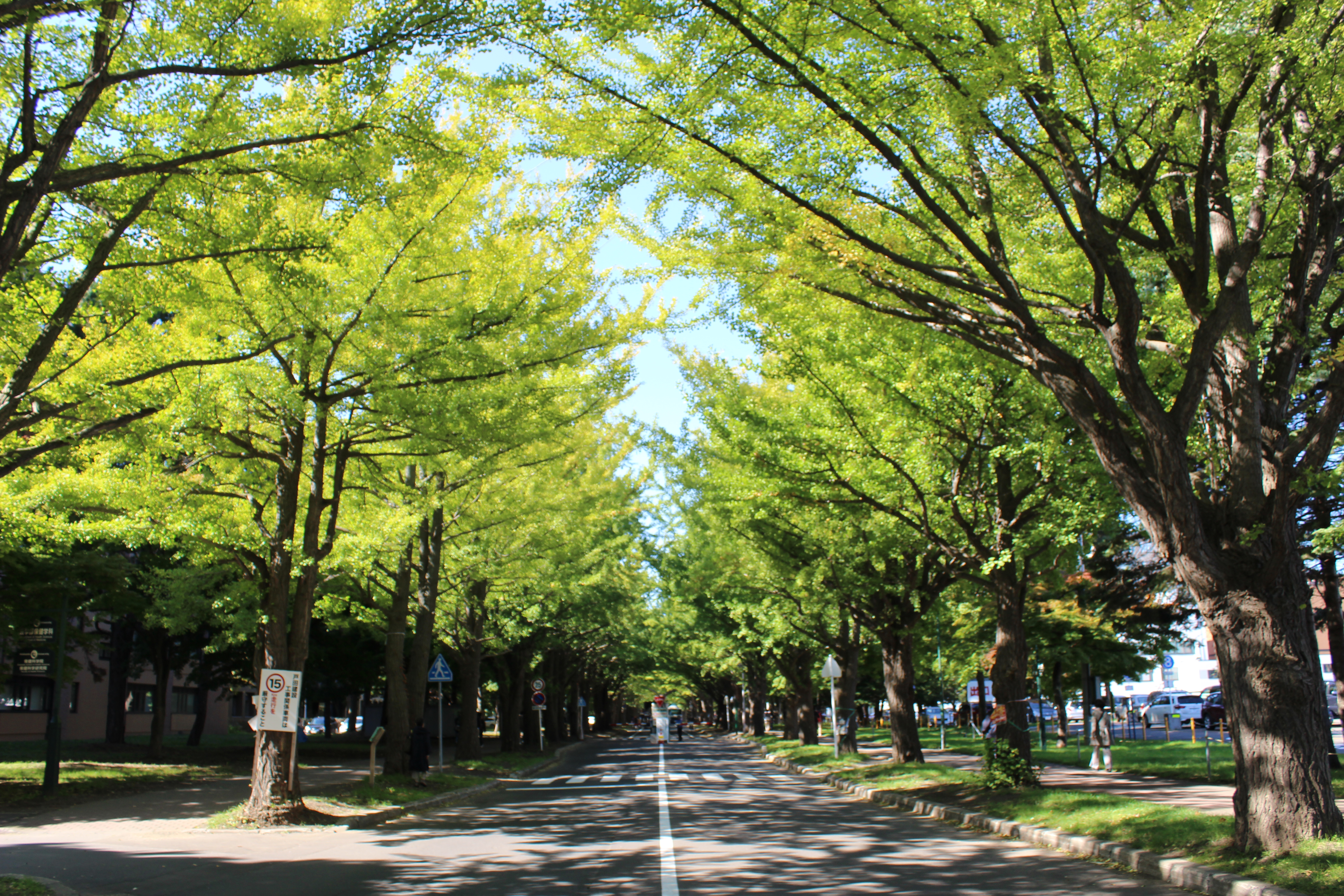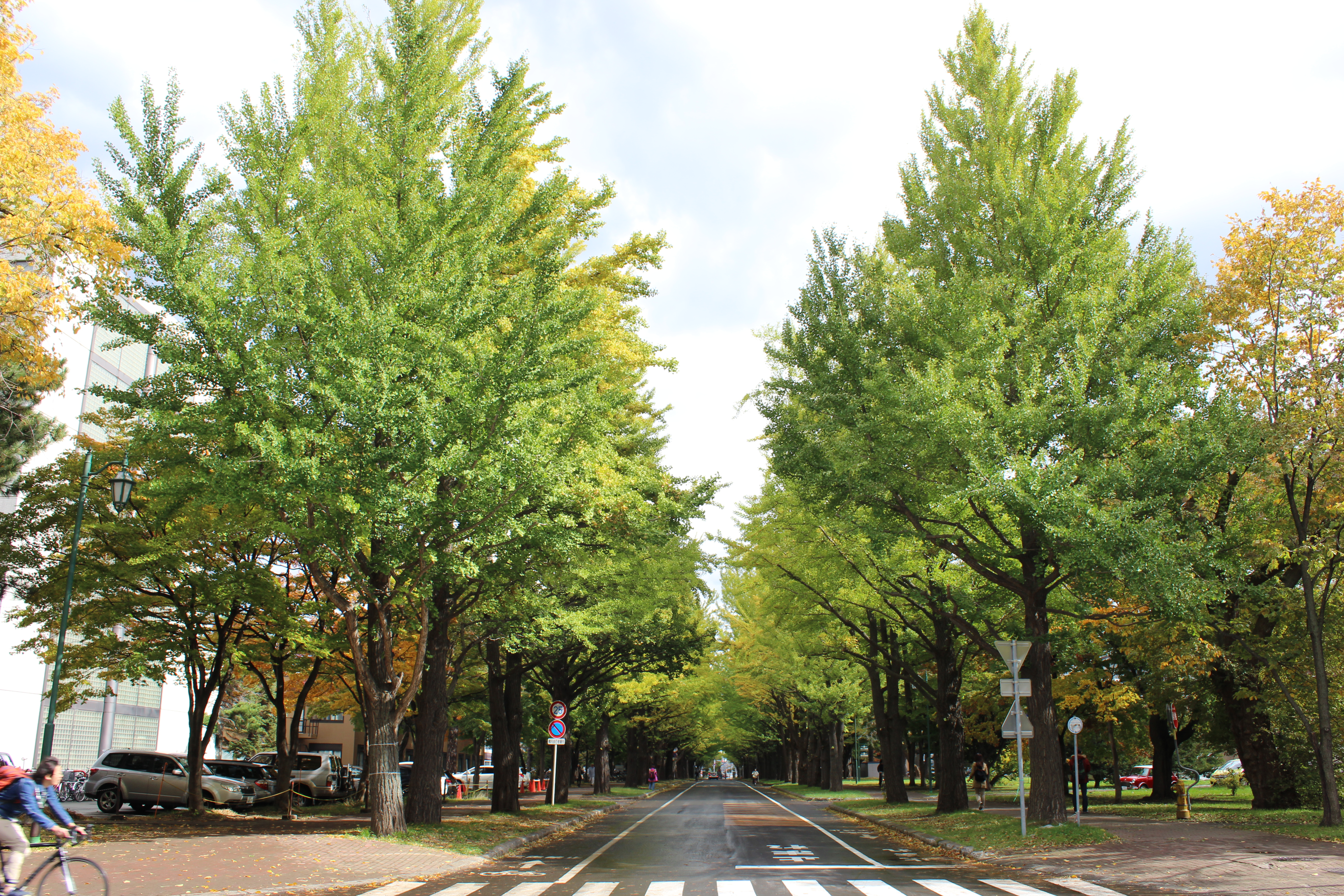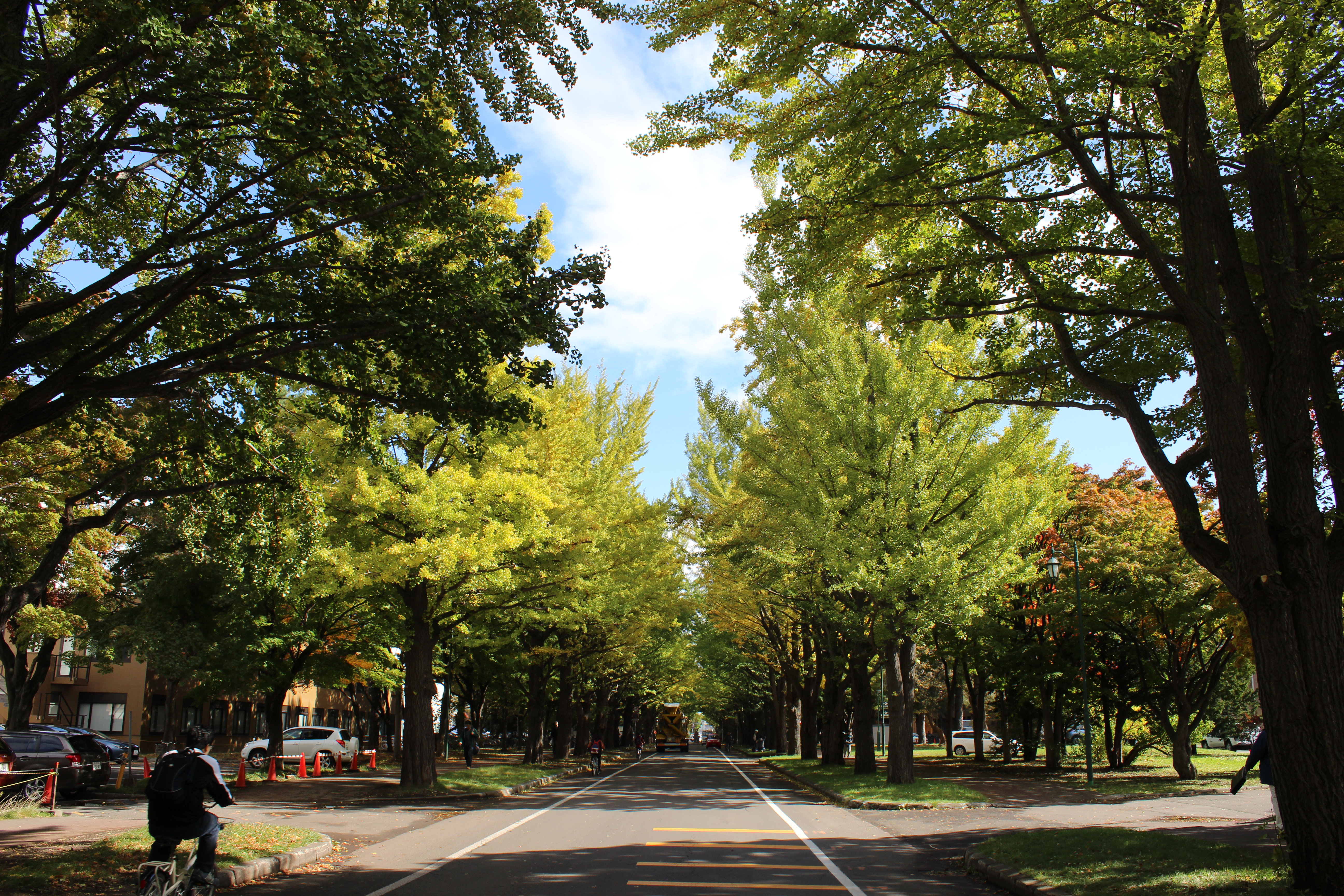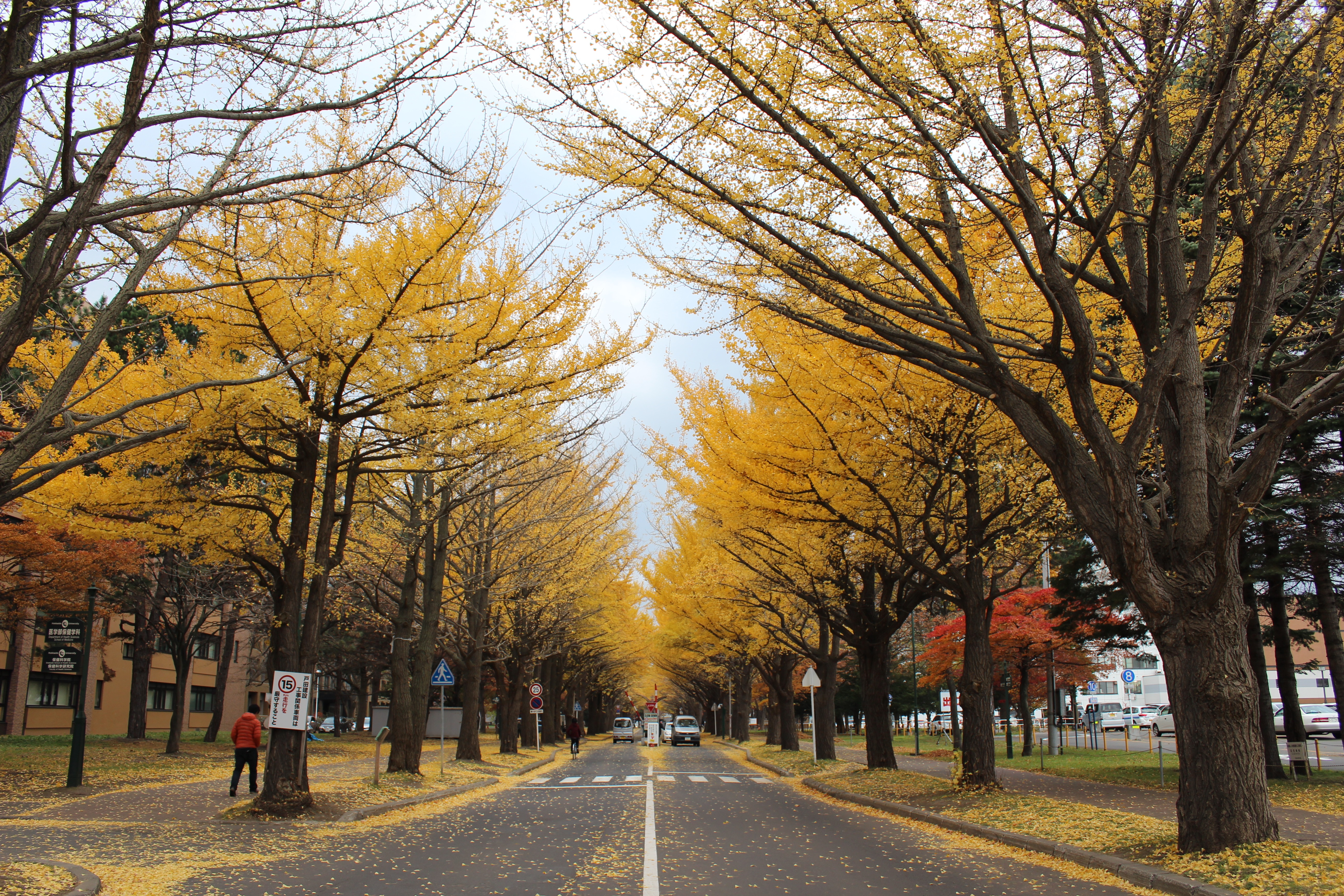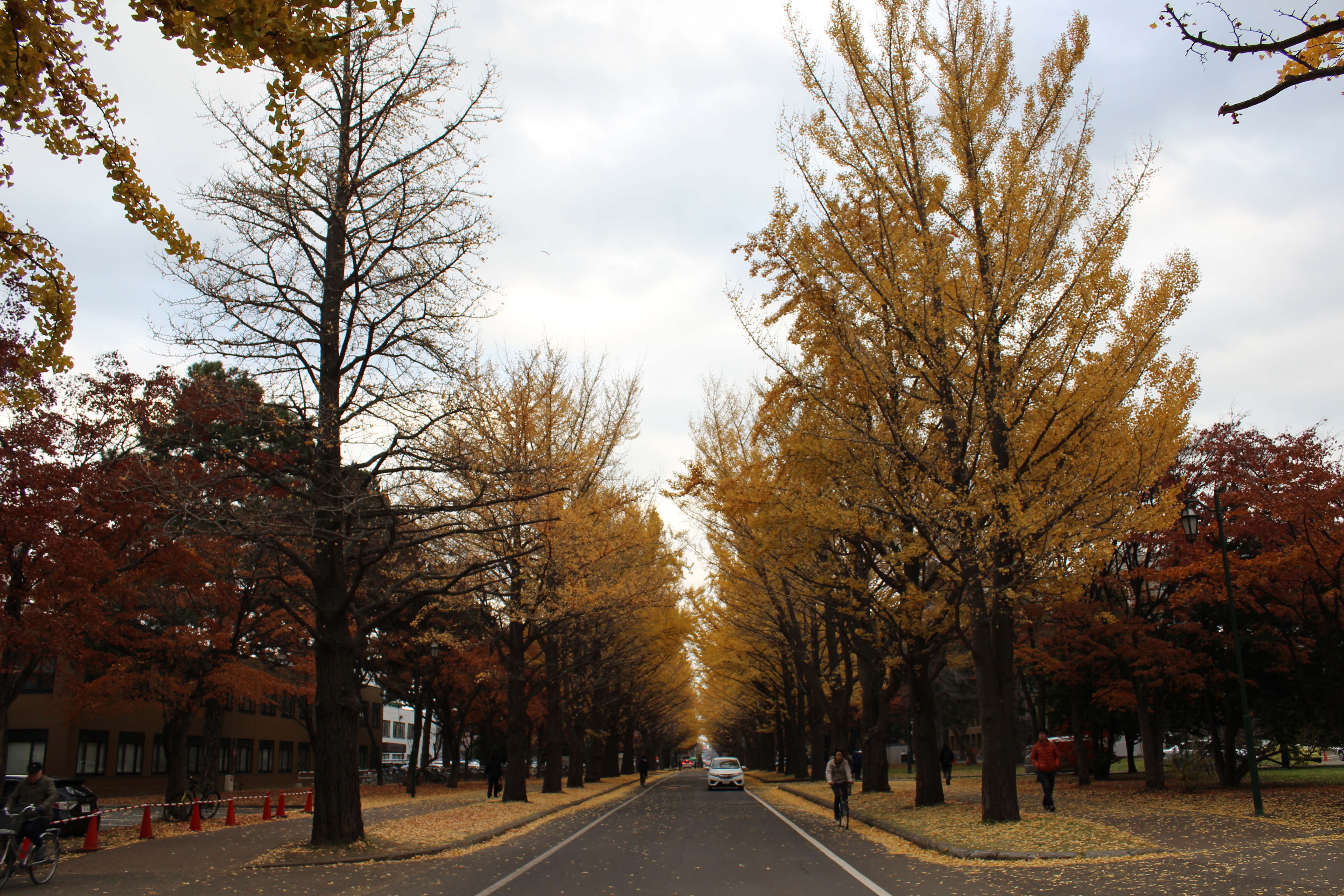 北大構内の北13条通り両側、東西約380メートルにわたる70本のイチョウ並木。例年10月下旬から
