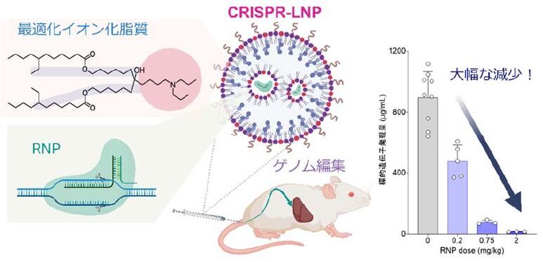 LNPは薬物の体内動態を制御する技術(Drug delivery system: DDS)の一つです。研究グループはこれまでに、CRISPR/Cas9タンパク質-RNA複合体(ribonucleoprotein: RNP)をLNPに封入した製剤(CRISPR-LNP)の開発に成功しています。