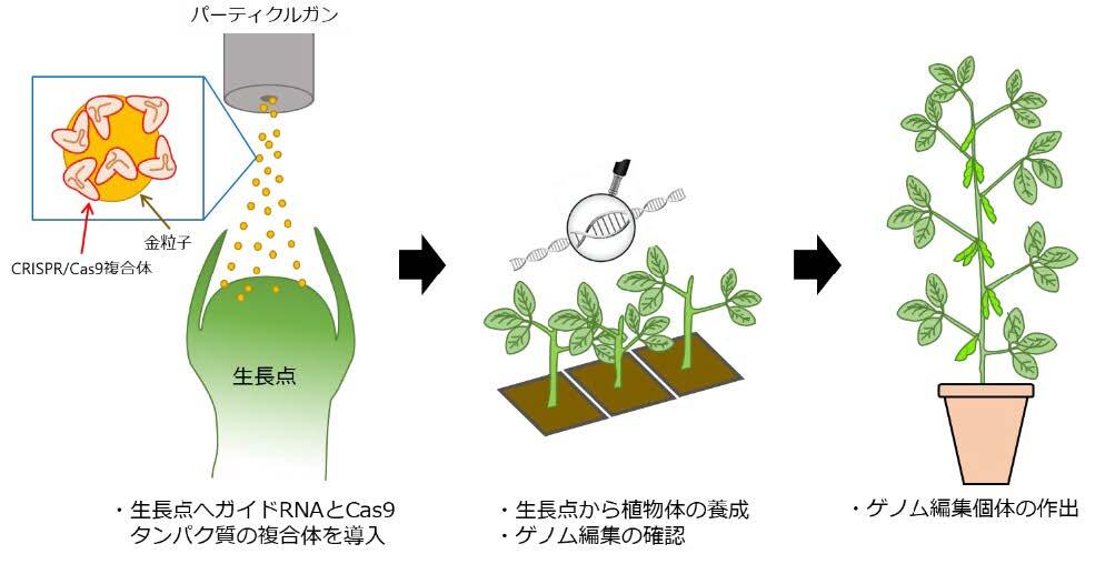 本研究では、ダイズの複数品種を対象に外来DNAを導入することなく、胚軸の生長点にガイドRNAとCas9タンパク質の複合体を物理的に導入してゲノム編集個体を作出しました。日本のダイズ品種「ユキホマレ」、「エンレイ」や「フクユタカ」を用いて、アレルゲンタンパク質の一つであるGly m Bd 30Kと呼ばれるタンパク質を作らないゲノム編集個体を作出しました。この方法を利用すれば、これまでゲノム編集が難しかった品種についてもゲノム編集を行うことができ、新たな品種改良方法としての利用が期待されます。