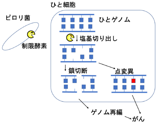 胃がんの主な原因はピロリ菌ですが、それがどのようにしてヒトのゲノムに働きかけて、がんを起こすかは不明でした。本研究では、ピロリ菌の持つ特別な制限酵素(DNAを特定の配列で切るハサミ)が、ヒトのゲノムに働いて変異と切断を起こし、がんを創り出す次の四つの証拠を得ました。