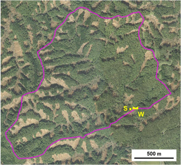研究対象流域(ピンク色の実線で囲われた範囲)の地震直後の空中写真。もともと森林に覆われていたが、地震による斜面崩壊で37%の森林が破壊された。W地点に堰を設置し、流域からの流出量Rを観測。S地点で降雨量Pを観測。