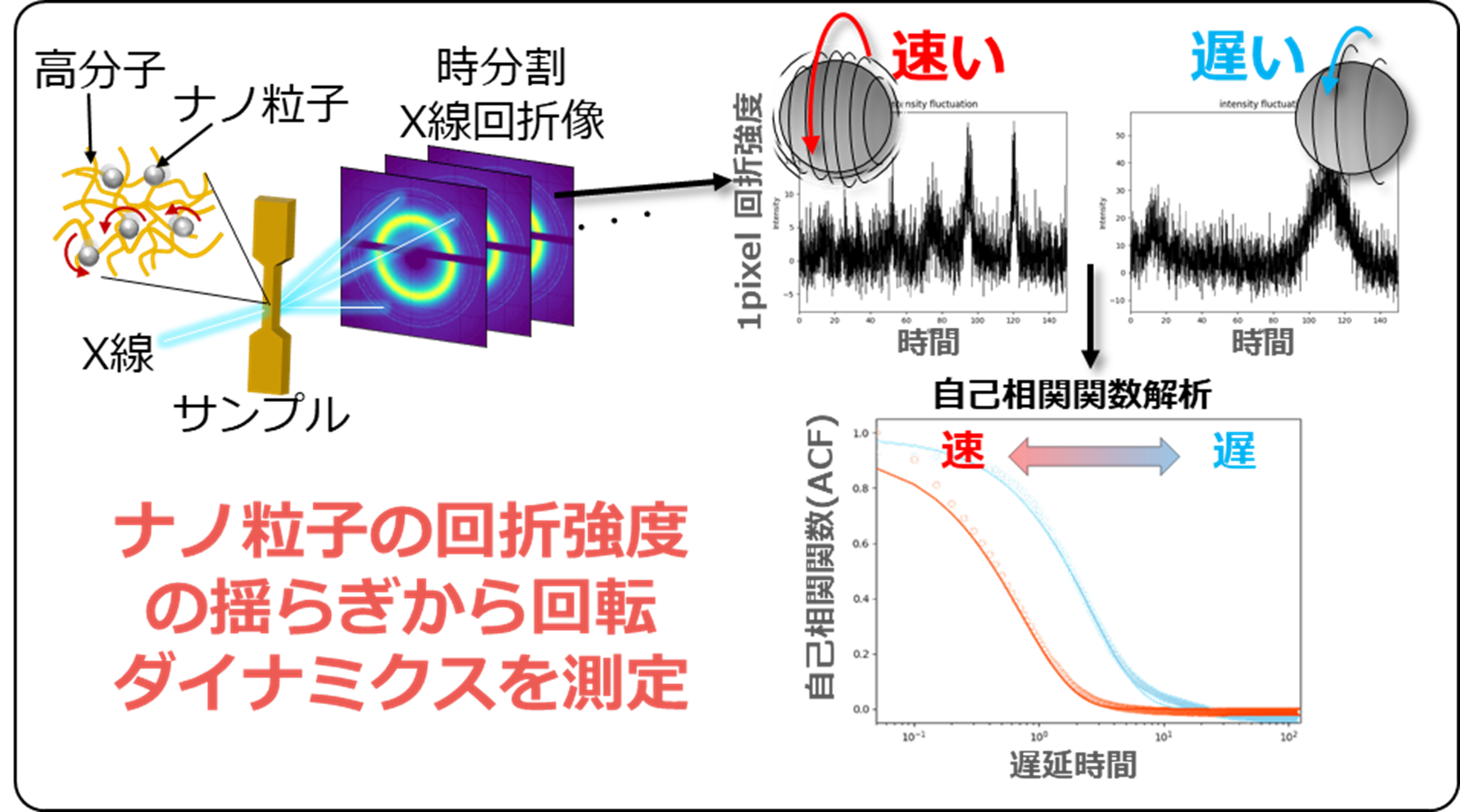 高分子にナノ粒子を添加した複合材料は、ゴムやプラスチックなどの様々な材料として広く使用されています。これらの材料の柔らかさや耐久性は、内部に分散したナノ粒子の運動性、特に回転運動に大きく依存します。したがって、ナノ粒子の回転運動を可視化する手法は材料開発において極めて重要ですが、そのような運動を汎用的に観測する方法はこれまでほとんど存在しませんでした。研究グループは、時分割X線回折像からナノ粒子の回転運動を抽出する新しい手法「Diffracted X-ray Blinking(DXB)法」を開発し、様々な高分子中のナノ粒子に適用しました。この手法では、X線回折強度の揺らぎを自己相関関数(ACF)で解析することで、ナノ粒子の回転運動を推定します。この解析手法により、時分割X線回折像から高分子中のナノ粒子の回転運動を捉えることに世界で初めて成功しました。さらに、これらの高分子の温度変化や相転移に伴うわずかなナノ粒子の回転運動の変化も可視化することに成功しました。今回の成果は、高分子材料の粘弾性や相転移の機構をナノスケールで直接評価する新しい手法を提示するものであり、今後の高分子材料研究や新素材開発への大きな貢献が期待されます。